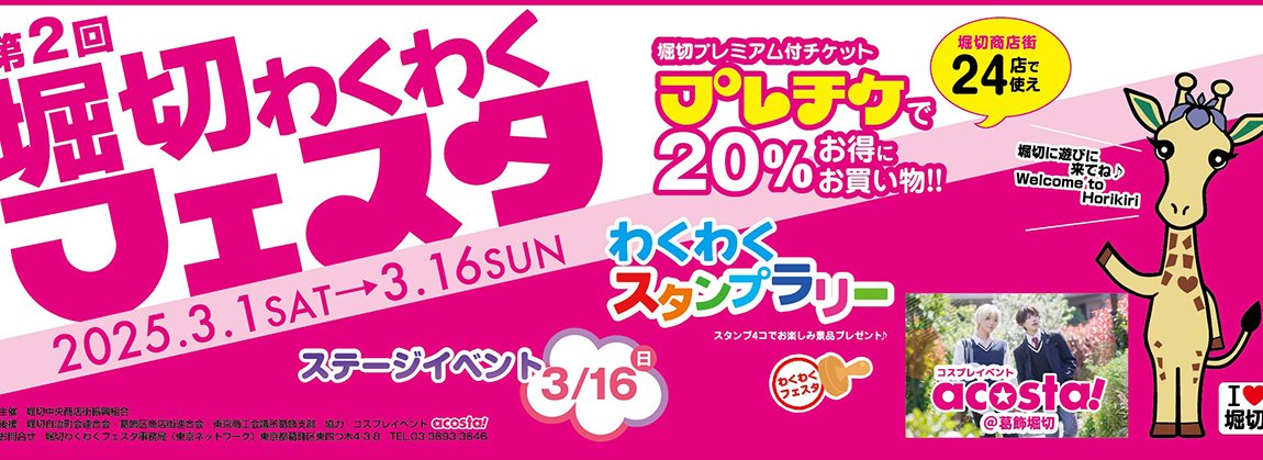 第2回 堀切わくわくフェスタカラオケ大会・フリーマーケット・グルメ&ショップ:2025年3月15日(土) 開催!ステージイベント・フリーマーケット・グルメ&ショップ・コスプレ:2025年3月16日(日)開催!わくわくスタンプラリー:3月1日(土)~3月16日(日)堀切プレミアム付…